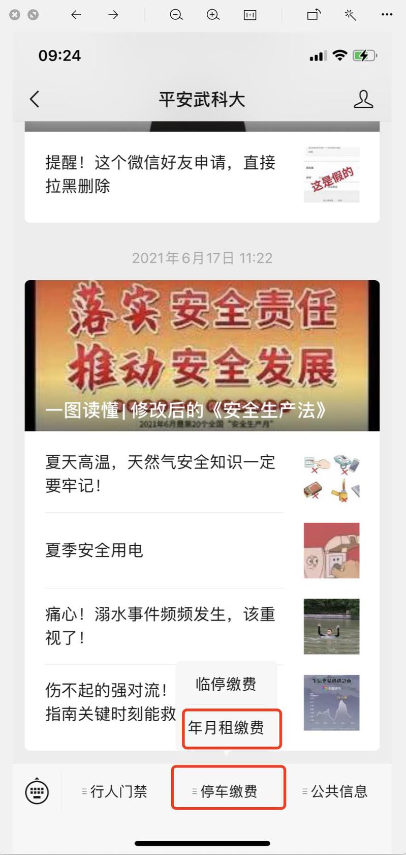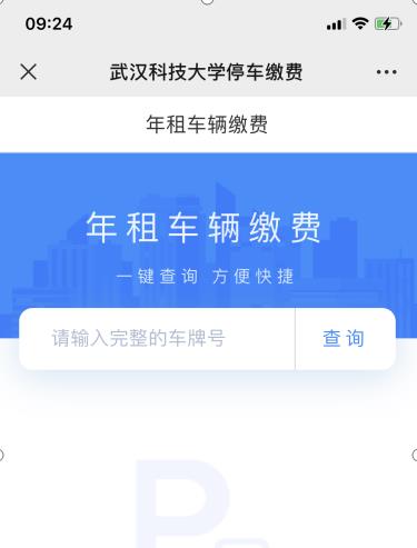 (一)关注“平安武科大”微信公众号,进入公众号后,依次选择“停车缴费”、“年月租缴费”,随即进入功能页面,输入正确的车牌号(只有车辆管理系统中存在的车辆才能够查询),点击查询,即可显示缴费界面。