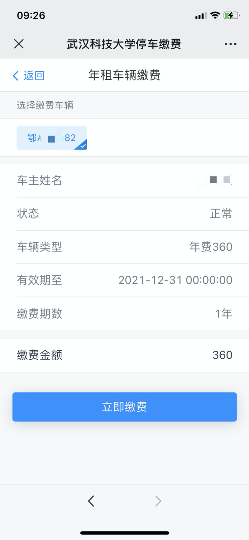 (二)点击“立即缴费”后会进入微信支付页面,支付成功后年月租缴费整个流程完成,车辆的有效期时间已自动延长一年;