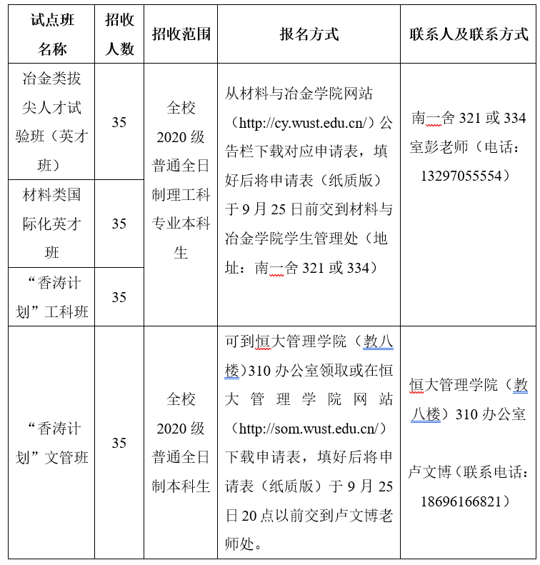 冶金类拔尖人才试验班(简称英才班)、材料类国际化拔尖创新人才培养试点班(简称材料类国际化英才班)、“香涛计划”试点班(含工科班和文管班)是我校进行多样化人才培养模式改革的重要举措,现面向2020级新生进行选拔,具体安排如下。